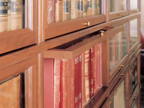 Made in the USA, this classic Legacy Barrister Bookcase features three interchangeable stacking receding glass door shelf sections. Simply styled with straight edges, the Legacy lawyer bookcase is hand made using sustainably sourced North American hardwood. The fully assembled solid wood shelf sections securely stack together with an interlocking system. No tools required – simply unpack and stack the glass door sections. Easily add more shelf sections as your library grows. The receding glass door sectional unit is well built with a lacquered bronze knob and a mechanical equalizer to keep the door from binding and allow for easy, one-handed operation.